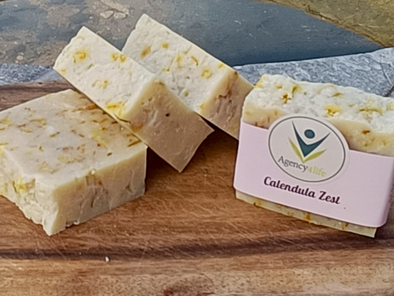 Brighten your day with Calendula Zest, blending olive oil, shea butter, and sweet almond oil with vibrant calendula petals and lemongrass oil. Perfect for normal to dry skin, this nourishing bar gently cleanses, hydrates, and revitalizes, leaving skin soft, radiant, and refreshed with a zesty, uplifting glow.